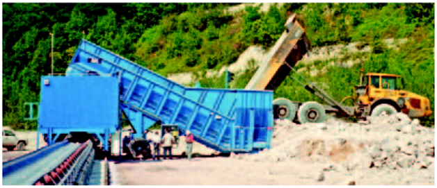 自卸卡車從后部將物料倒入進(jìn)料裝置的水平段,該段可以儲存一定的物料。