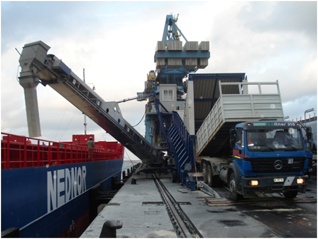 裝船機(jī)進(jìn)料口一般在輸送帶上方,位置很高,自卸卡車卸貨時車廂后部位置很底;采用裝載機(jī)雖然能將物料送到一定高度,但效率很差;裝船機(jī)能力一般很大,要確保裝船機(jī)的運(yùn)行效率,須有多輛運(yùn)輸車為其供料,最大限度地提高系統(tǒng)的處理速度和使車輛定位延遲效應(yīng)最小化,且具備穩(wěn)流功能,保證連續(xù)、均勻、平穩(wěn)地供料;自卸卡車每車二三十噸,要讓車子迅速卸貨,須提供緩沖儲存裝置;輸送帶水平段要有很大的強(qiáng)度,承受物料對進(jìn)料裝置的強(qiáng)烈沖擊;進(jìn)料裝置與裝船機(jī)要能有分有合,移動時要同步,具有移動的靈活性;該裝置可以輕松遷移到其它港口處,從而提升設(shè)備的利用率;當(dāng)輸送有塵物料時,可配套高效的除塵設(shè)施。